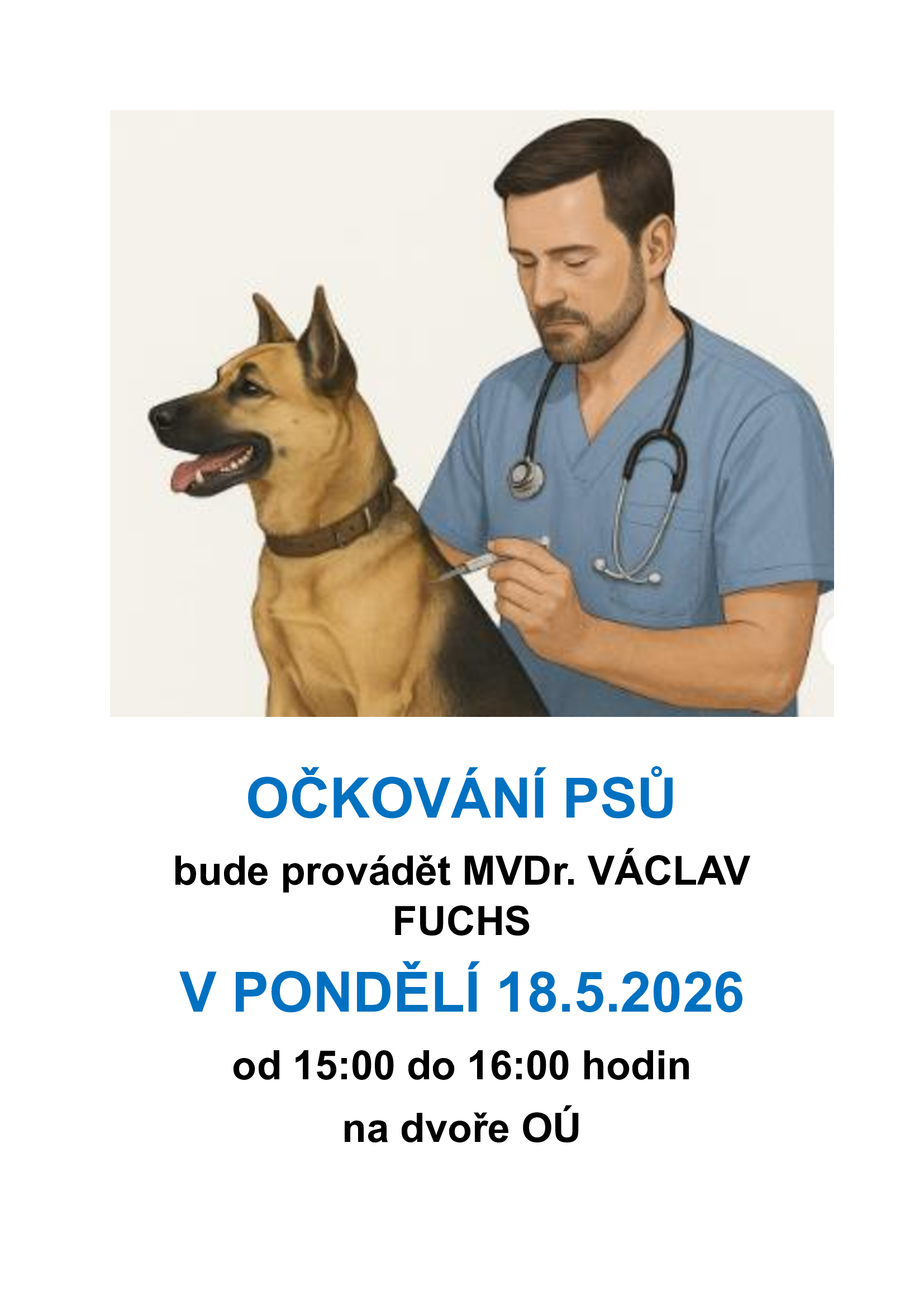 Dne 18.5.2026 bude probíhat na dvoře OÚ Kamenné Žehrovice očkování psů v době od 15,00 do 16,00 hodin.